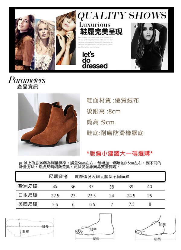 商品規格 品牌定位 : 流行時尚 品牌 : Alice 適用性別 : 女生 靴子款式 : 踝靴 尺寸 : 23cm, 23.5cm, 24cm, 24.5cm 版型 : 偏小 鞋面主材質 : 緞布/絨布 鞋面材質說明 : ☆鞋面材質:優質絨布 ☆鞋底材質:耐磨防滑橡膠底 顏色 : 黑色系, 棕色系 後跟款式 : 粗鞋跟 後跟高 : 高跟6~8cm 後跟高說明 : ☆後跟高:8cm 產地 : 中國 備註 : 產品內容: ☆鞋面材質:優質絨布 ☆鞋底材質:耐磨防滑橡膠底 ☆後跟高:8cm ☆筒高:9cm ☆尺寸:36.37.38.39 ☆顏色:黑色,卡其色 ☆產地:中國 ☆配件:無 (配件均是模特兒自行搭配無附) ☆洗滌方式:請避免使用烘衣機烘乾,請勿使用含有漂白溶劑的洗劑 切勿使用快速及強力清潔功能之洗衣粉或冷洗精,建議深色與淺色衣物分開洗滌 體驗說明 使用方法說明 ◎ 正常穿脫 商品顏色會因個人電腦螢幕不同有顯色上之差異,以實際商品顏色為準,請見諒。若介意的朋友請勿訂購!! 注意事項 01.送達地點有否限制:無 02.銷售注意事項:注意!!此商品為預購款!訂單成立後須等7-14天的工作天後,陸續安排出貨,謝謝。!! ★本商店無法接受退貨與換貨的情況: ■換貨後恕不接受退貨。 ■超過鑑賞期10天。 ■商品已使用。 ■商品污損、被破壞的情況下。 ■鞋盒、附屬品污損、被破壞、遺失、丟棄等情況下。 ■商品被乾洗、修理的情況下。 ■退換貨時請將商品無損及完整包裝,外盒勿損毀,並以廠商寄送時的包裝再原封備妥,若紙箱已遺失,請於商品外盒上再包裝,勿直接讓商品原廠外盒粘貼宅配單或書寫文字,原廠外盒損毀或是商品缺件 ,將無法受理退貨或視損毀程度折扣退款金額。