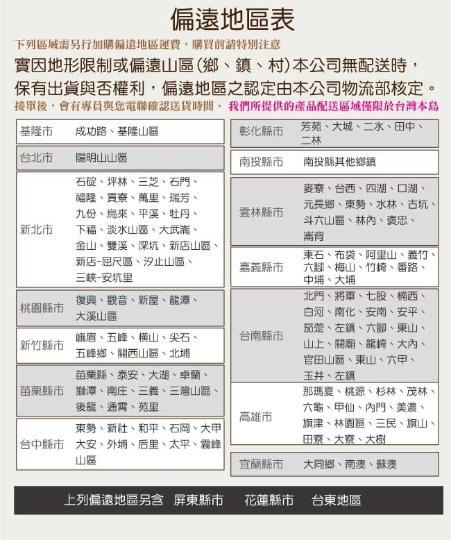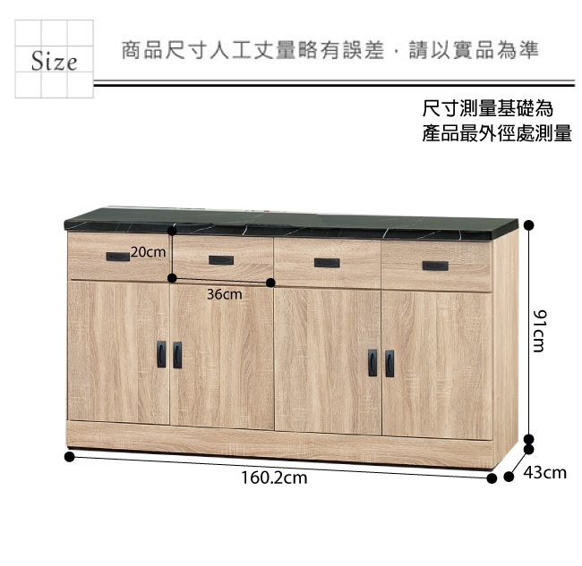 商品規格 類型 : 餐櫃 開門方式 : 拉門 層數 : 兩層 抽屜 : 四抽 尺寸 (公分) : (寬)160.2x(深)43x(高)91/公分 主材質 : 木質 材質說明 : 主體:防蛀木心板 塗裝:優利坦耐磨三層全包式塗漆處理 軌道:五金滑軌結構 石面:2cm雲紋石面 五金:防夾手緩衝門片五金 顏色 : 棕色系 組裝方式 : 免組裝 鑑賞期說明 : 鑑賞期內,應保留贈品及附件完整(如有遺失部分,需酌收費用) 配送注意 : 1.接單後,會有專員與您電聯確認送貨排程。 2.若需吊車或其他方式吊運,請由訂購人自行處理,本公司無此服務,特以此告知。 3.商品由配送人員送達時,請檢查商品有無缺失,避免造成爭議。 4.訂購前請確認商品尺寸,大型物件因人工丈量,難免會有些許誤差值(約正負3cm),詳細的尺寸以實品為主。 5.有電梯不收取費用! 無電梯樓層超過4樓以上(包含4樓)一樓層費用200元,現場支付給服務員。 偏遠地區說明 : 1.實因特殊地型限制及(山區、濱海鄉、鎮、村、區)無法送貨時,本公司保有出貨與否之權利(下單後會由專人告知是否可配送)。 2.偏遠地區因車趟較少,配送天預計需7~20個工作天(不含假日),送貨前物流將與您確認送貨時間。(如遇特殊情況,依實際約定時間為主) 3.於配送完成後,如欲辦理退貨,因加購之運費為已發生之勞動服務,恕無法退還。 體驗說明 使用方法說明 無 注意事項 ◎注意事項: 1.接單後,會有專員與您電聯確認送貨時間。 2.需以吊車吊運以當地吊車行情計,費用由消費者支付。 3.備註:本商品不含圖片上、家飾...等,情境圖之內容僅供參考。 4.請於配送人員到場時,檢查商品有無缺失,以免造成爭議。 5.允許的誤差尺寸範圍+-2%。 6.因拍攝燈光與電腦解析度瑩幕不同可能會造成實品與網頁上商品有些許色差,商品以收到實品為主。 ◎收貨與退貨: 1.實因特殊地型限制及(山區、濱海鄉、鎮、村、區)無法送貨時,本公司保有出貨與否之權利(下單後會由專人告知是否可配送)。 2.有電梯不收取費用! 無電梯樓層超過4樓以上(包含4樓)一樓層費用200元,現場支付給服務員。 3.超過鑑賞期,恕不接受退貨。 4.限非人為因素破壞毀損,才可退貨。 5.若退貨時,收件時間請與廠商協調,確保自己權益。 6.退貨時應保留贈品及附件完整(如有遺失部分,需酌收費用)。 ◎備註: .無回收服務。 .收貨與退貨:實因特殊地型限制及(山區、濱海鄉、鎮、村、區)無法送貨時,本公司保有出貨與否之權利(下單後會由專人告知是否可配送)。 .花蓮(縣市)、台東(縣市)、屏東(縣市場及其它縣市屬於山區、濱海鄉、鎮、村地區無配送服務,如您有需求,則需另外收取運費。(您可直接訂購,後續由廠商報價。) ※由於加價配送服務為一次消耗性商品,若有退換貨等情形加購之運費恕無法退還 ※運費報價皆為單趟計算。 ※使用加價配送地區,收貨時間會比一般地區再增加10個工作天。
